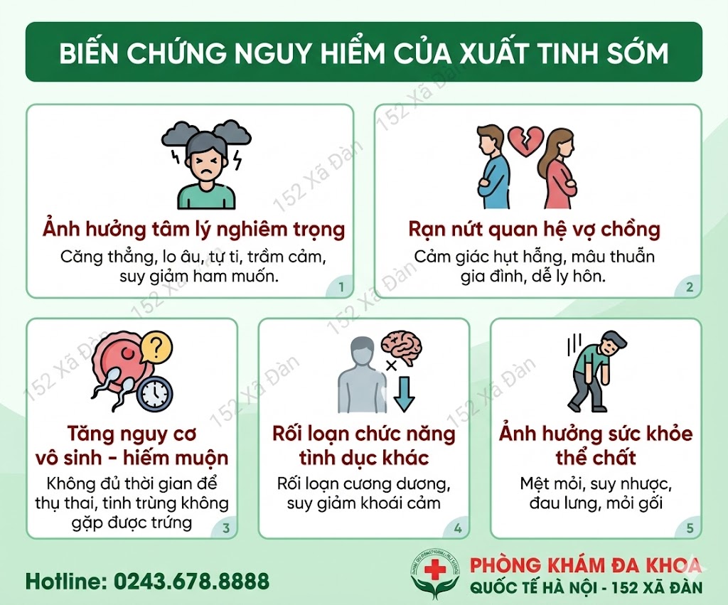 - Rối loạn chức năng tình dục khác: Xuất tinh sớm kéo dài có thể dẫn đến liệt dương, rối loạn cương dương, giảm ham muốn