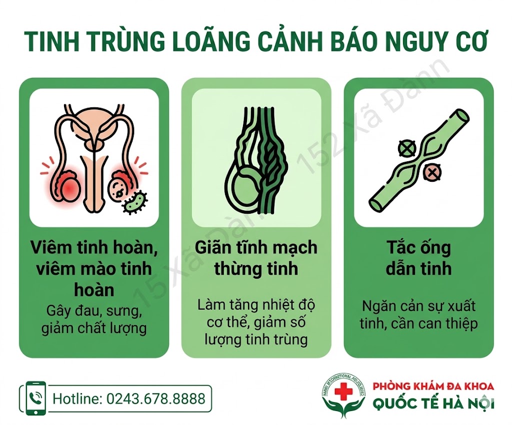 Khác với các nguyên nhân sinh lý, tinh trùng loãng do bệnh lý thường không tự cải thiện theo thời gian. Đây mới là nhóm nguyên nhân đáng lo ngại vì có thể ảnh hưởng trực tiếp đến khả năng sinh sản, thậm chí làm tăng nguy cơ vô sinh nếu không phát hiện và điều trị kịp thời.